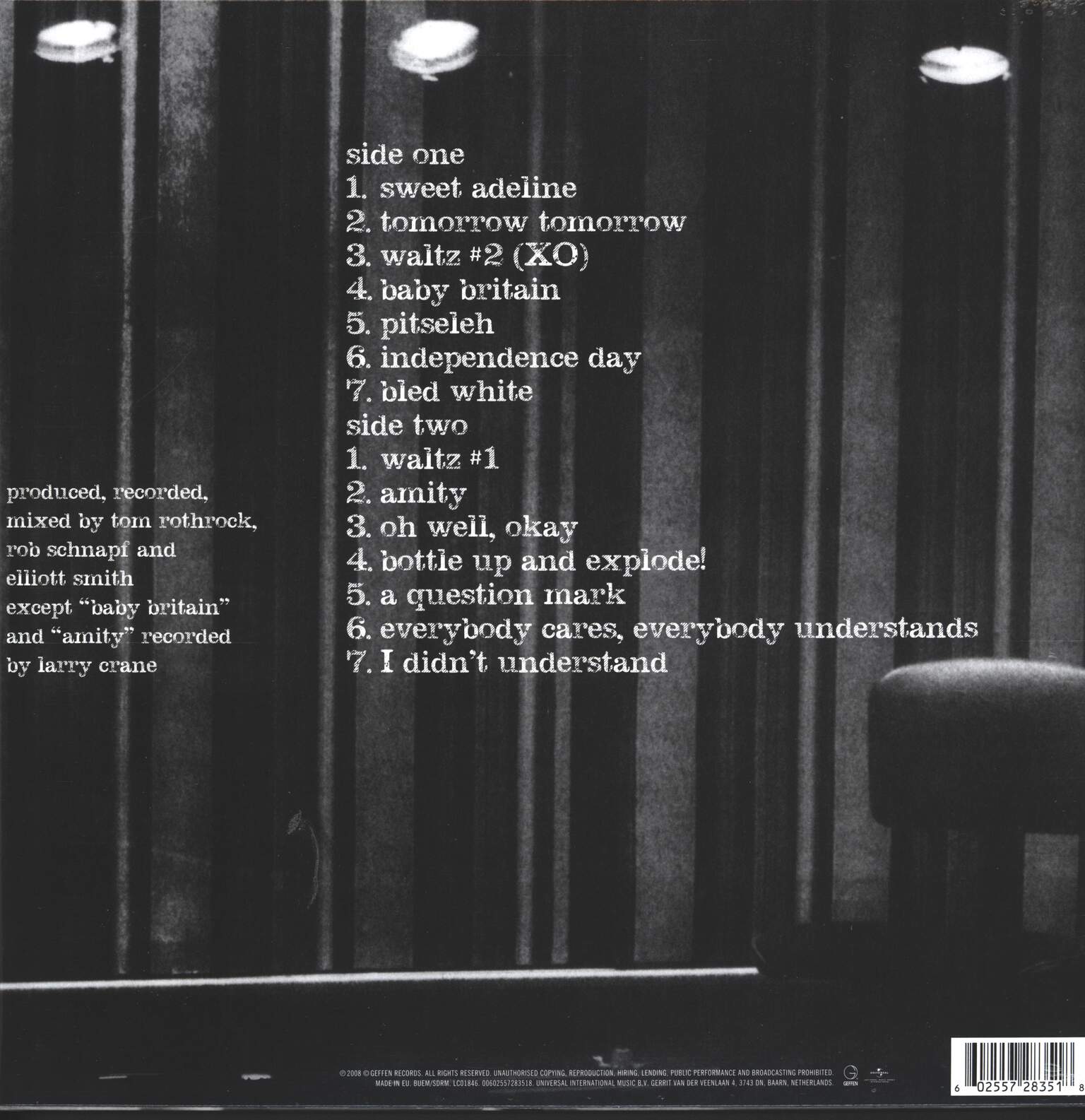 Recorded By – Elliott Smith (tracks: A1 to A3, A5 to B1, B3 to B7), Larry Crane* (tracks: A4, B2), Rob Schnapf (tracks: A1 to A3, A5 to B1, B3 to B7), Tom Rothrock (tracks: A1 to A3, A5 to B1, B3 to B7)