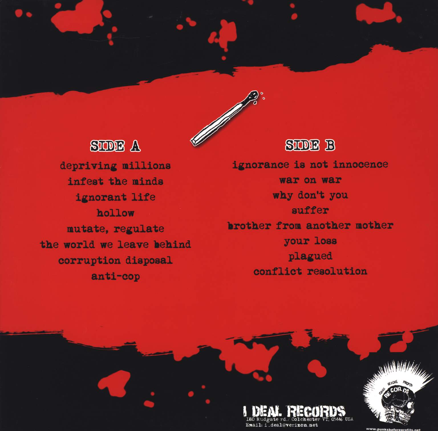 500 made; released by Punks Before Profits Records, I Deal Records, clear / red splatter vinyl, with insert