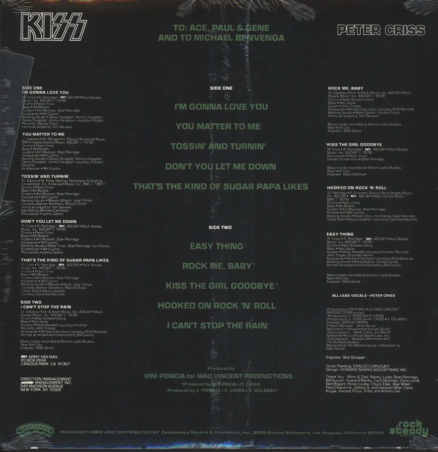 Producer – Peter Criss (tracks: B1 to B3), Sean Delaney (tracks: B1, B2), Vini Poncia
