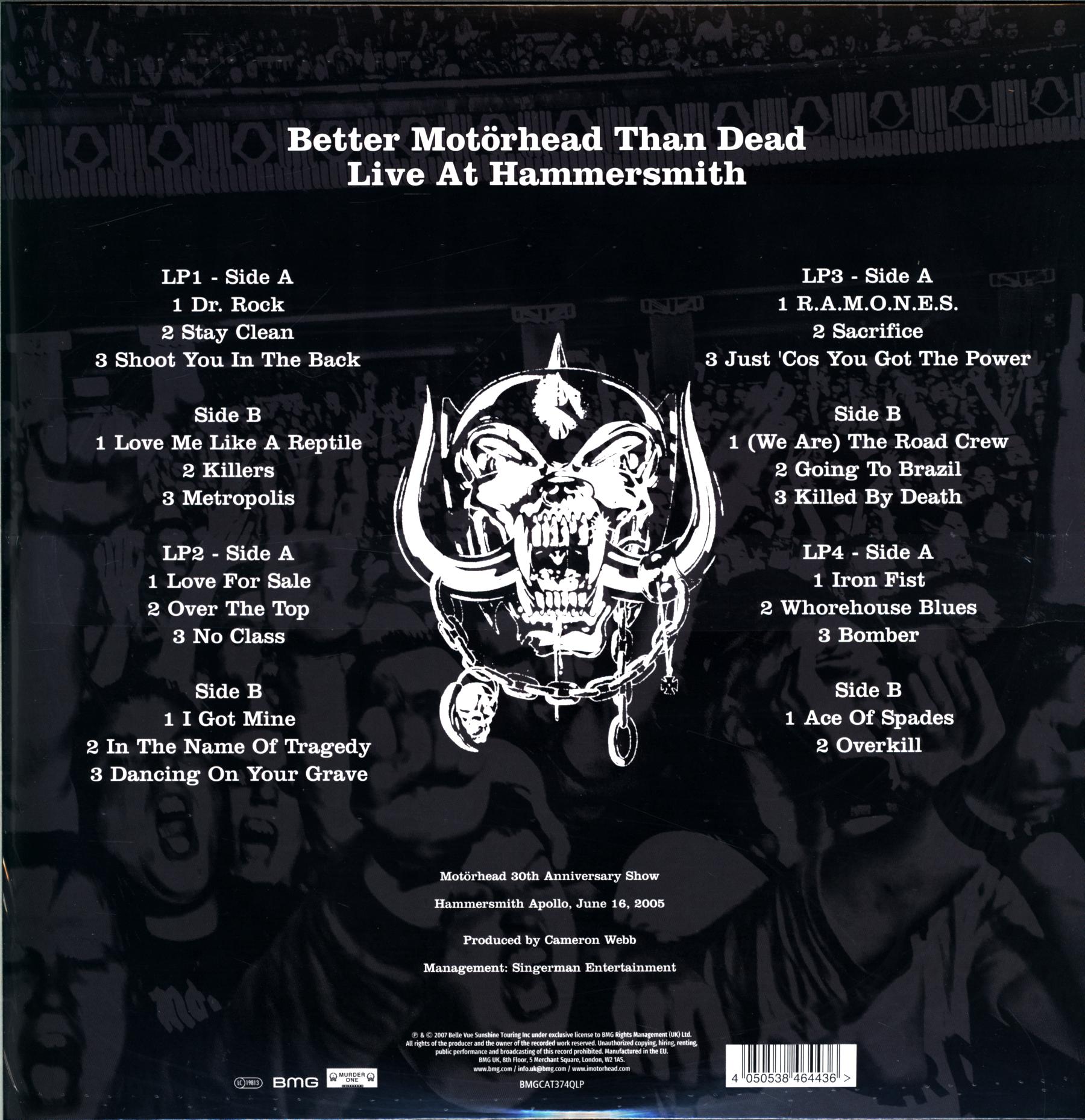 4-LP set of Motorheads 30th Anniversary Show, Hammersmith Apollo, June 16, 2005. Reissue, originally released 2007.