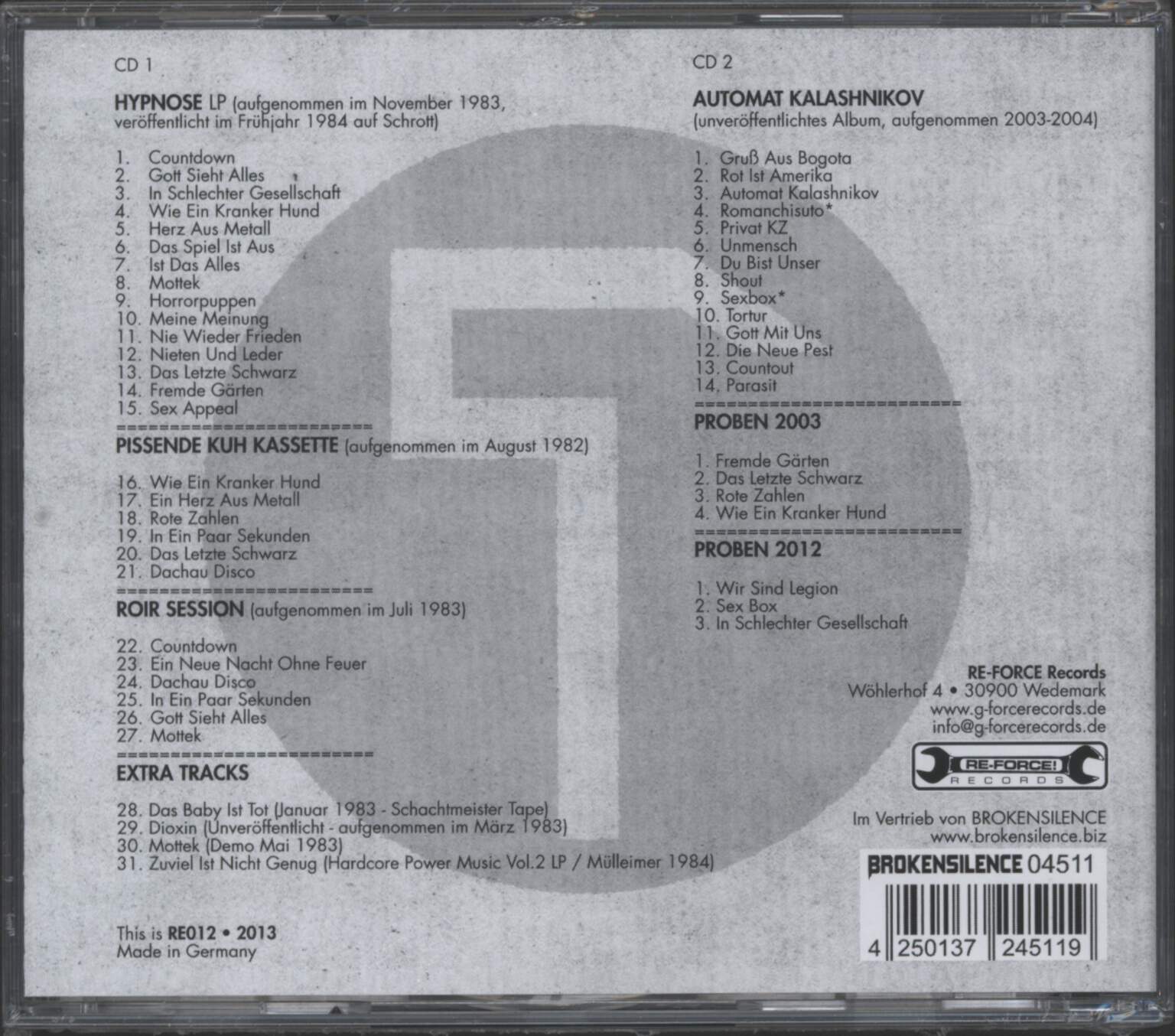 52-track double CD compilation with the complete recordings of the classic German Hardcore band: Hypnose LP (1983), Automat Kalashinikov (unreleased 2004 album) plus 22 demo recordings.