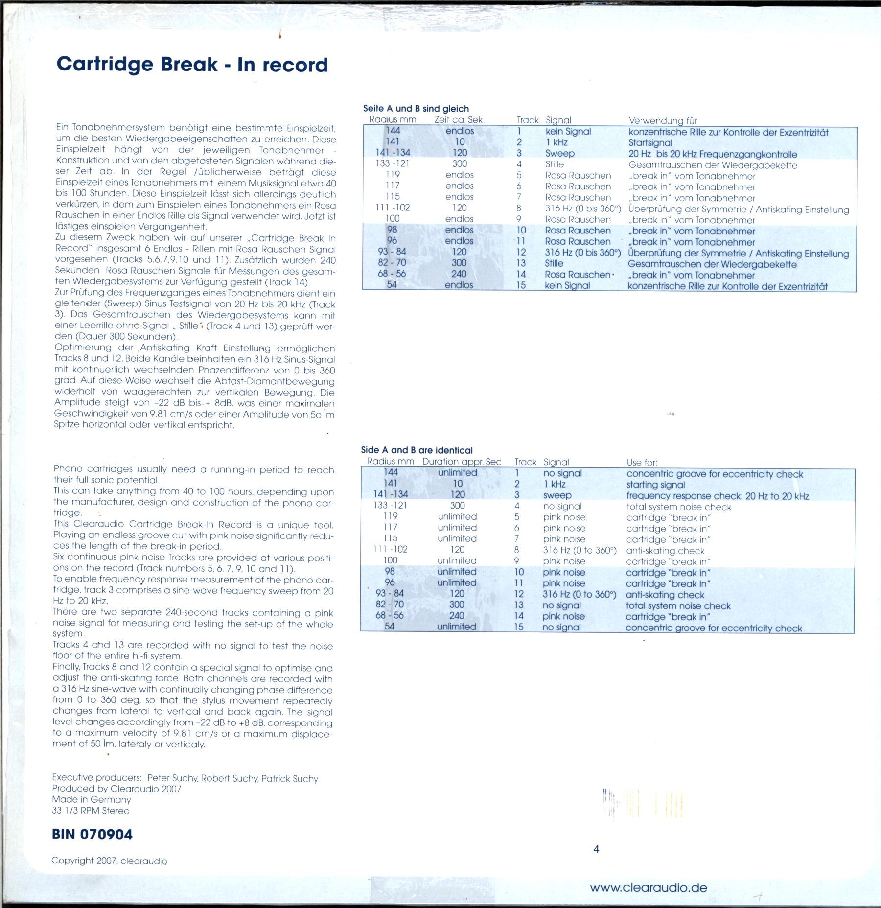This cartridge break-in LP plays an endless groove cut with pink noise to significantly reduce the length of the break-in period. A total of twelve continuous pink noise tracks are provided, 6 per side, at various positions on the record. In addition to the continuous cartridge break-in tracks, several other tracks are included to aid in the properly setting up the cartridge, arm and turntable, as well as other important aspects of a hifi system. The record is pressed on 180g vinyl. Side A and B are identical