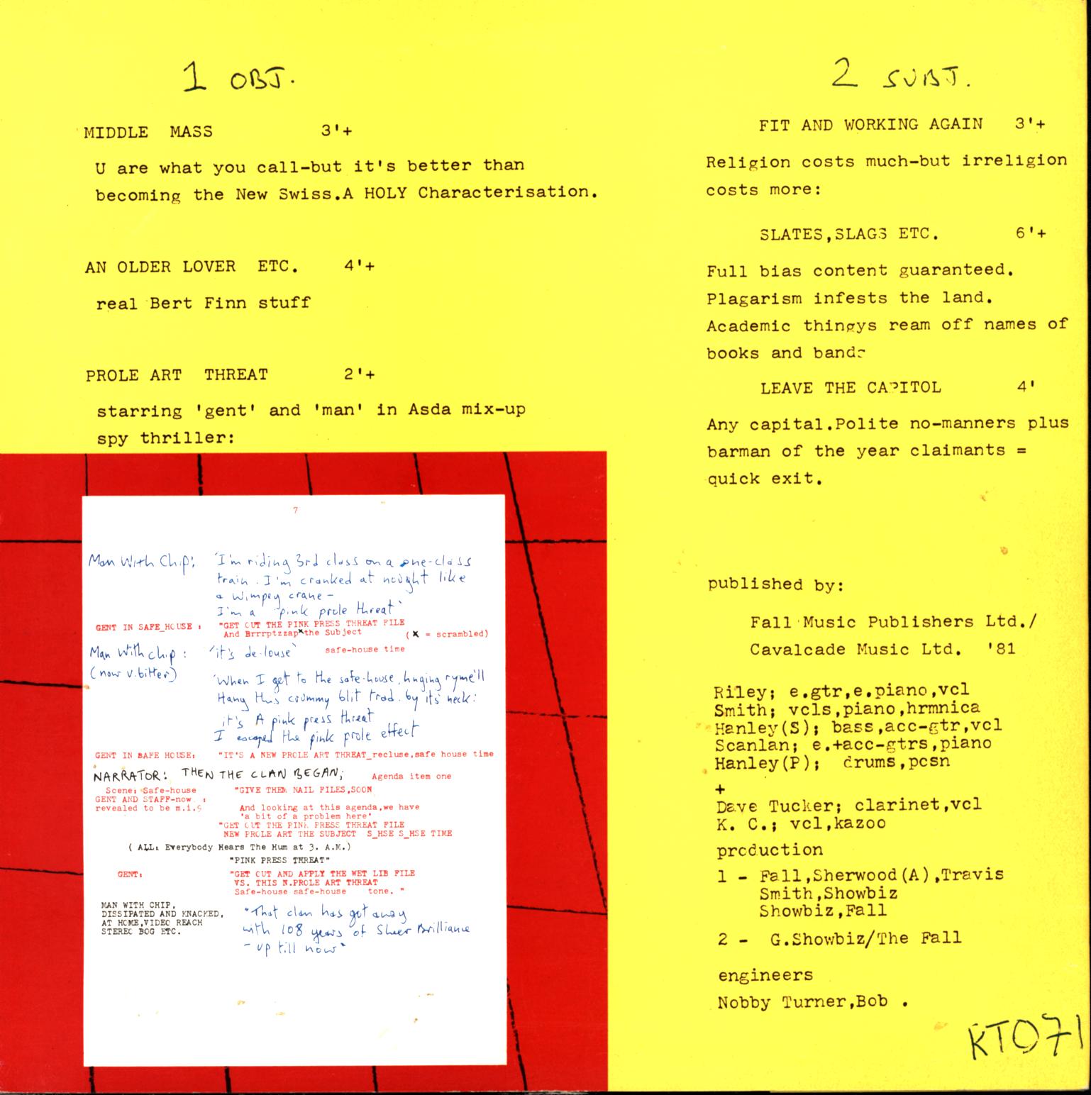 Producer – Sherwood (A)* (tracks: A1), Travis* (tracks: A1), Showbiz* (tracks: A2, A3), G. Showbiz* (tracks: B1, B2, B3), Smith* (tracks: A2), Fall* (tracks: A1, A3), The Fall (tracks: B1, B2, B3)