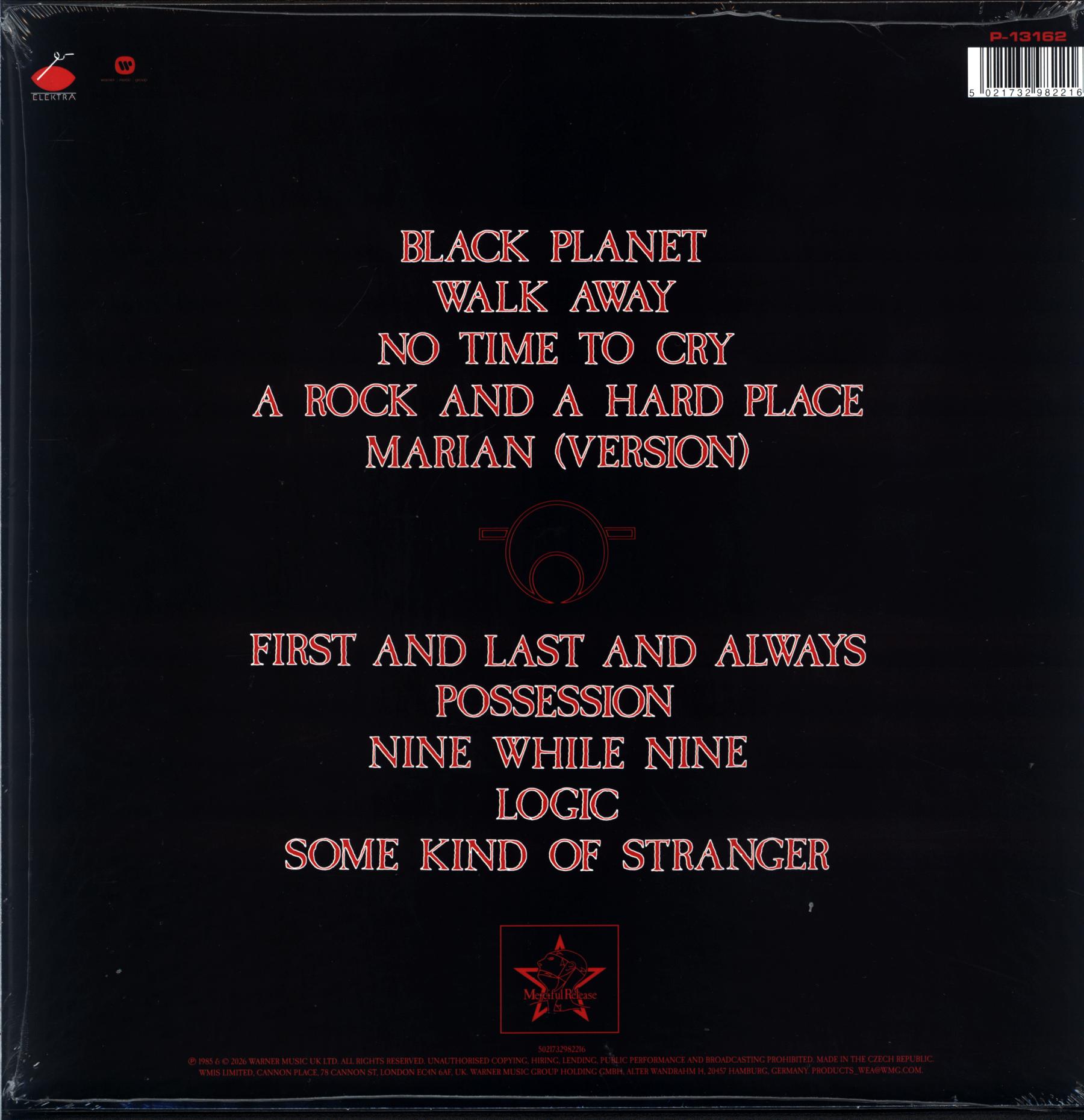'Previously released on vinyl in Japan in 1985, this version of The Sisters of Mercy's debut album features alternative versions of 'Black Planet', 'No Time To Cry', 'A Rock and a Hard Place' and 'First and Last and Always'. It has been newly remastered from the Japanese masters and pressed on black ice vinyl. Limited to 3000. Translucent Black vinyl. "Black Planet" features slightly different instrumentation and is 10 seconds longer "No Time to Cry" features different opening and ending instrumentation and sound effects "A Rock and a Hard Place" features additional guitar tracks and a slightly different drum track "First and Last and Always" features a totally different drum track as well as a totally different arrangement and has an intro which is 15 seconds longer